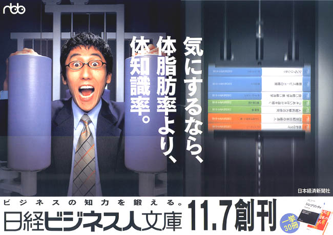 O.A:2000.10〜1クール 日経新聞がこのたびビジネスマン向けの文庫本シリーズをスタートすることとなり、それのキャンペーン。 初めは、スチールのみだったのだが、日経さんがメチャメチャ気に入ってくれたらしく、TV-CFも追加になりました。 電車中吊り 東京:JR線(E電区間)、営団地下鉄全線、小田急線全線、東武東上線、 東急線全線、西武線全線、京王線全線 大阪:JR線(普通快速)、大阪市営地下鉄、阪急線全線、近鉄線全線、京阪線全線 名古屋:名古屋市営地下鉄線 *ポスター掲出車両数、約 30,000両 新聞広告 全国紙:日本経済新聞(全ページ)朝日新聞(全5段)読売新聞(全5段) ブロック紙:北海道新聞、中日新聞(全5段)西日本新聞 地方紙:河北新聞、信濃毎日新聞、静岡新聞、新潟新聞、京都新聞、神戸新聞、 山陽新聞、中国新聞、四国新聞、熊本日日新聞 *12月以降も、引き続き発売日広告を実施します。 販売促進物 店頭掲示用ポスター類、カラーワイヤーPOP(3種類)棚用ディスプレー台、 棚シール、ポケットカレンダー ほか TV-CF テレビ東京系6局ネット「ワールドビジネスサテライト」内にて |